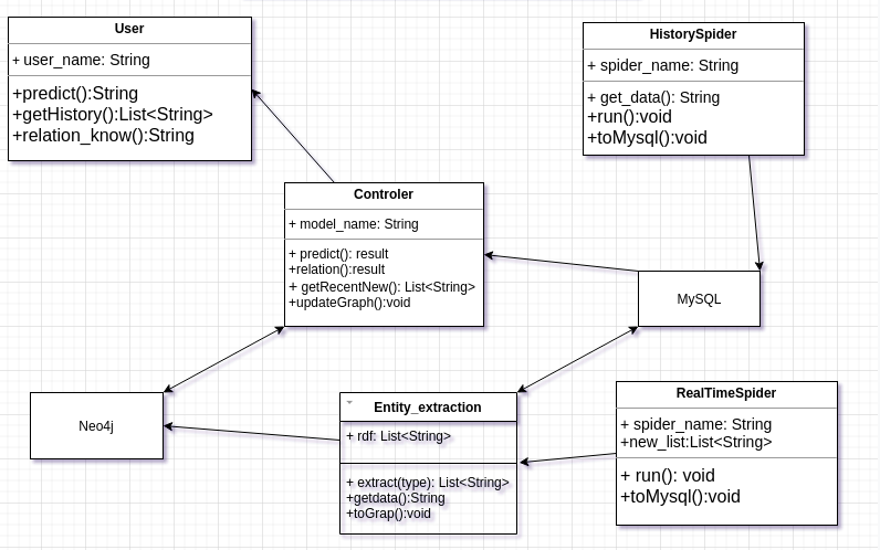 在本系统中,用户仅和contoler产生交互关系,所取数据均由contoler来完成。同时HistorySpider仅将爬取的数据存入mysql数据库,由Entity_extraction来进行实体抽取,关系抽取,实体链接等,并将产生的三元组存入neo4j,RealTimeSpider同样仅联系Entity_extraction,将数据给予Entity_extraction提取知识,存入MySQL,并隔一段时由Entity_extraction进行知识图谱的更新。