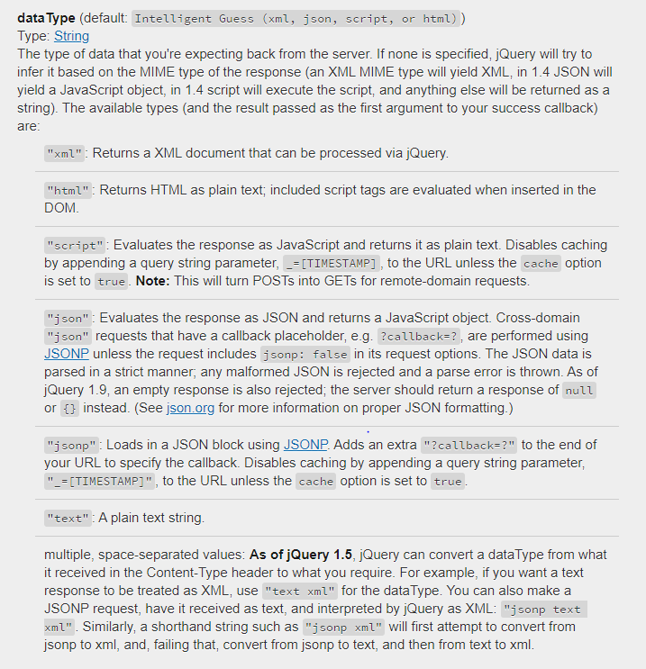jquery中的ajax请求,不支持二进制流。datatype格式如下: (参考地址:https://api.jquery.com/jQuery.ajax/)