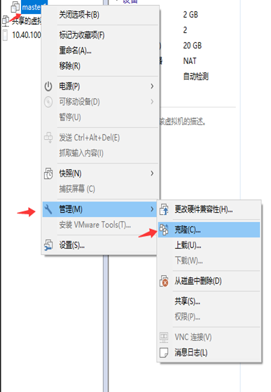 1.鼠标右键虚拟机,点击管理、克隆,开始克隆。