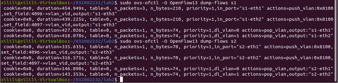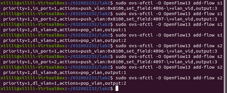 3.通过命令行终端输入“ovs-ofctl”命令,直接在s1和s2上添加流表,划分出所要求的VLAN。