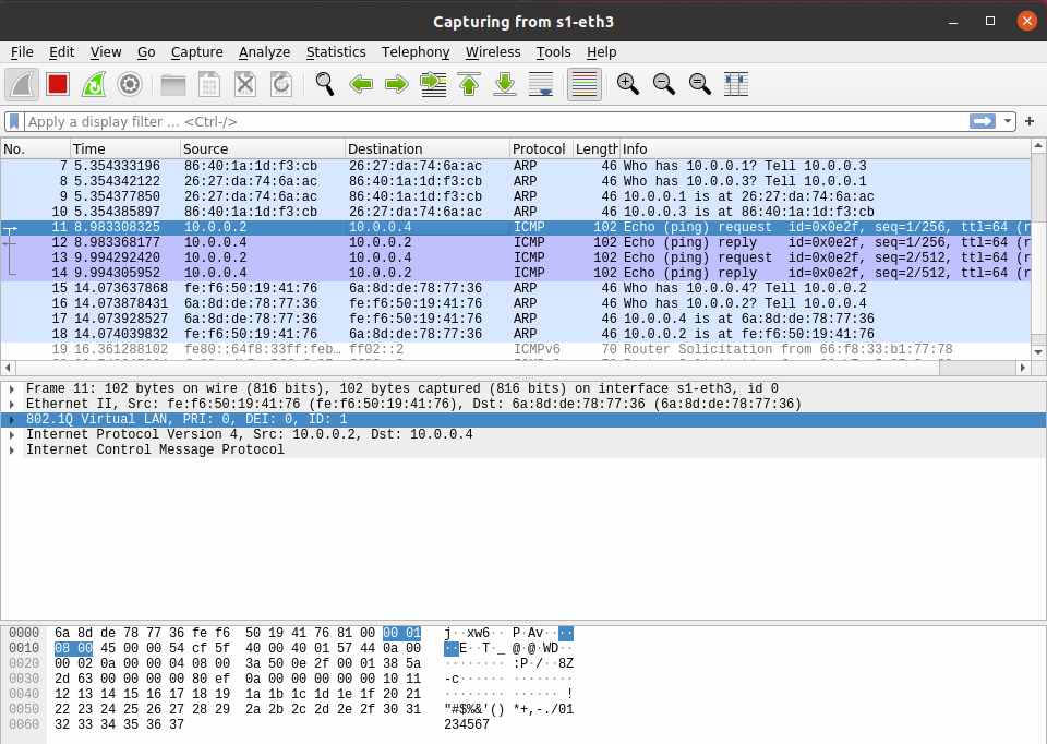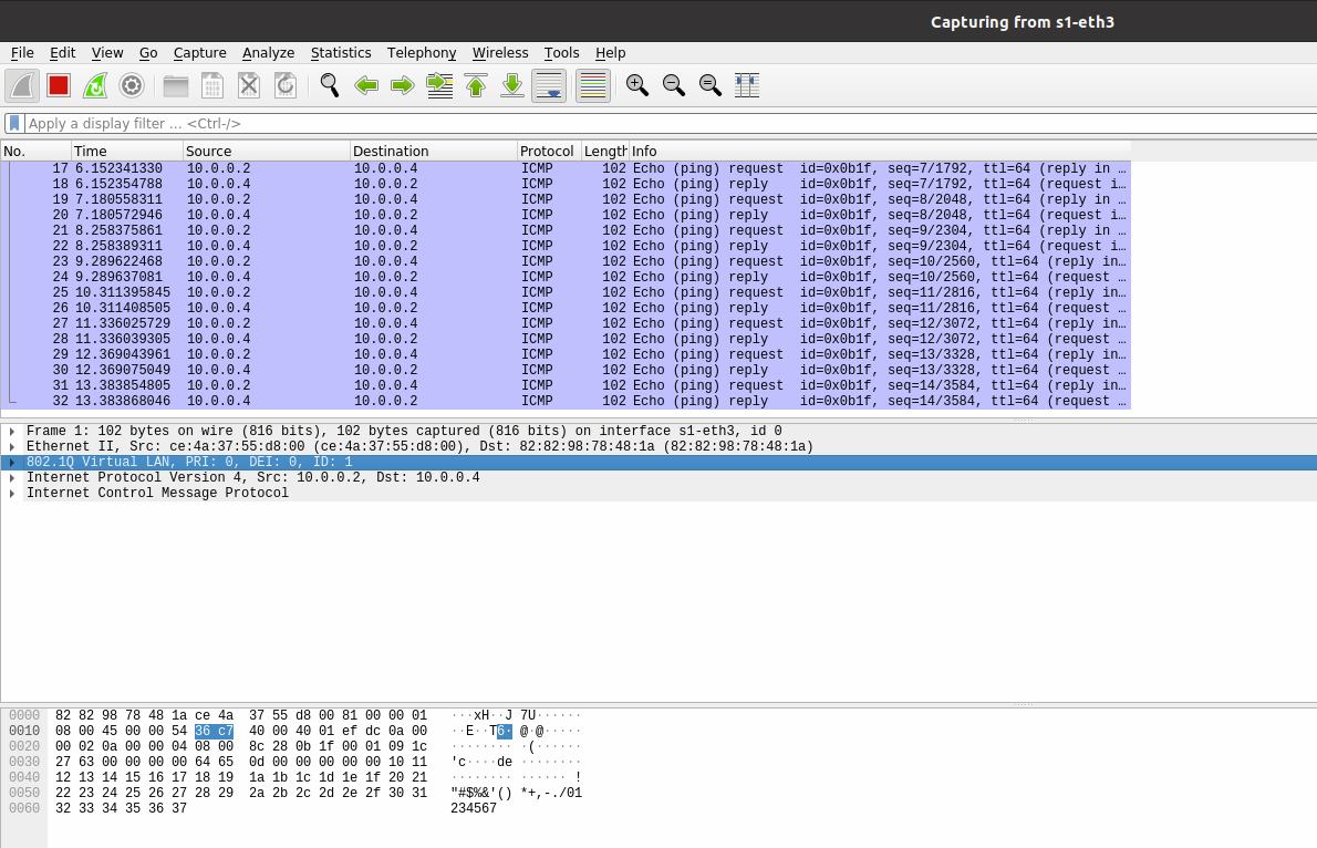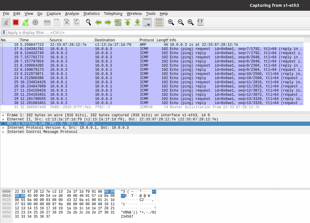 Mininet命令行界面输入 h1 ping h3 ,抓取的包id为1