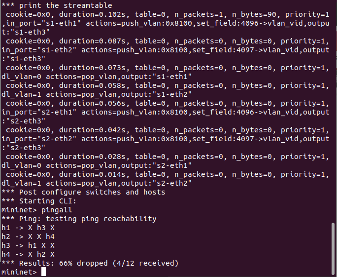 s2.cmd('sudo ovs-ofctl -O OpenFlow13 add-flow s2 priority=1,in_port=2,actions=push_vlan:0x8100,set_field:4097-\>vlan_vid,output:3')