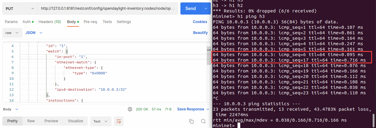 2、通过Postman工具调用OpenDaylight提供的API下发流表,实现拓扑内主机h1和h3网络中断10s。