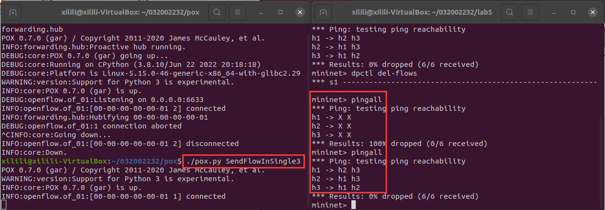 2、编写Python程序自定义一个POX模块SendFlowInSingle3,并且将拓扑连接至SendFlowInSingle3(默认端口6633),实现向s1发送流表规则使得所有主机两两互通。