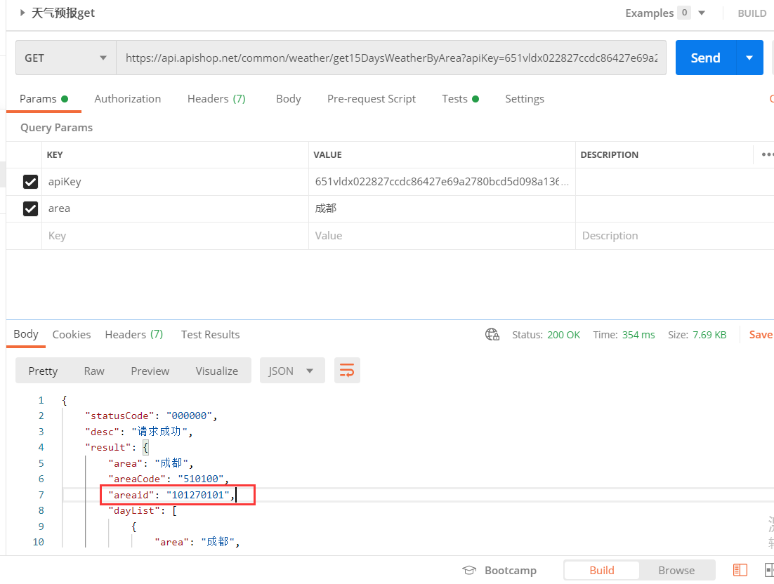 第一个接口的参数及响应数据如下,而我们需要获取返回值中的areaid,并将其设置为全局变量