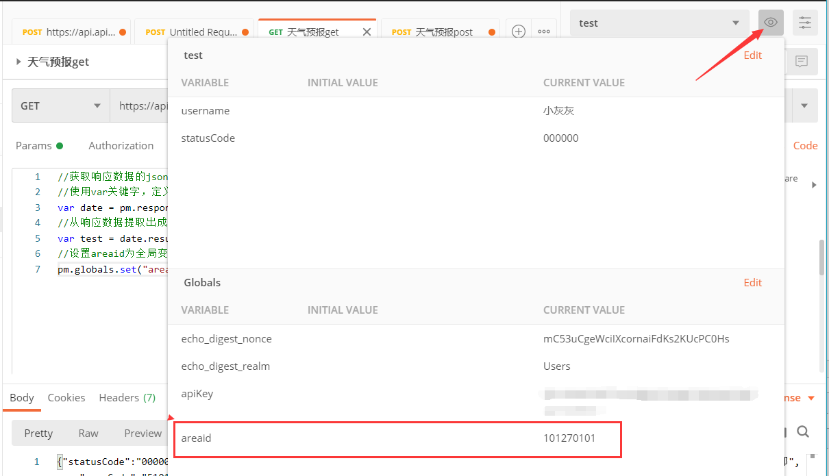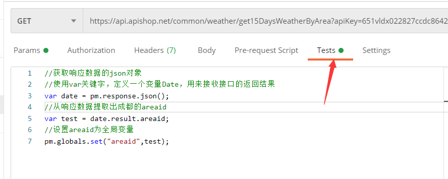 在此接口的tests中,获取areaid,并将其设置为全局变量,代码如下