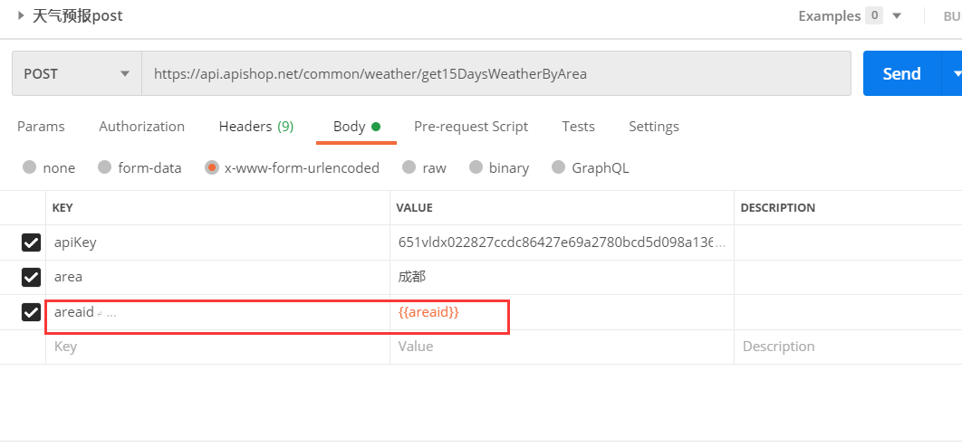 例子:最常使用的免费的天气接口 https://api.apishop.net/common/weather/get15DaysWeatherByArea