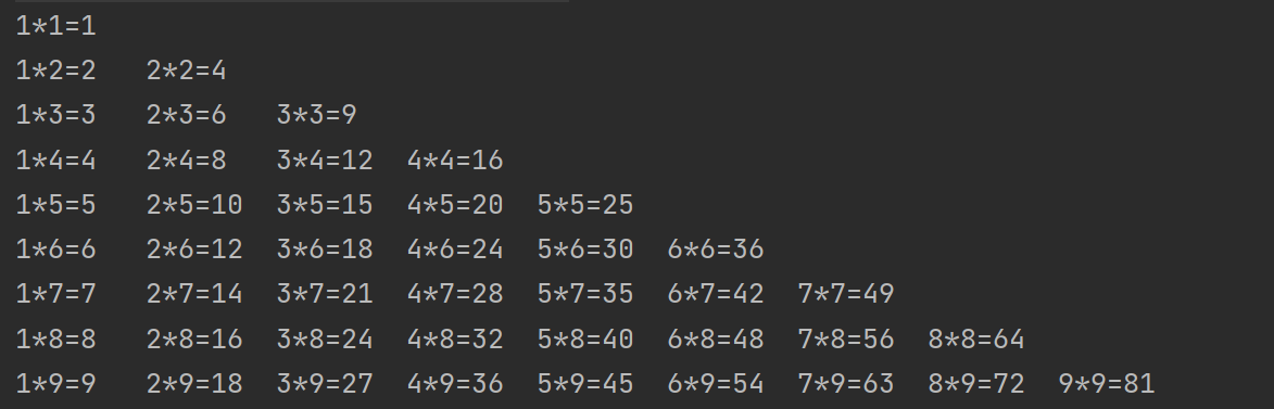 //先打印第一列 //用循环包起来 //去重j<=i //调整样式 for (int i = 1; i <= 9; i++) { for (int j=1;j<=i;j++){ System.out.print(j+"*"+i+"="+(j*i)+" \t"); } System.out.println(); }![]()