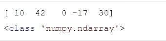 import numpy as np ls1 = [10, 42, 0, -17, 30] nd1 =np.array(ls1) print(nd1) print(type(nd1))