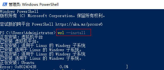 以管理员身份打开 PowerShell,执行 wsl --install 命令 安装 WSL 2: