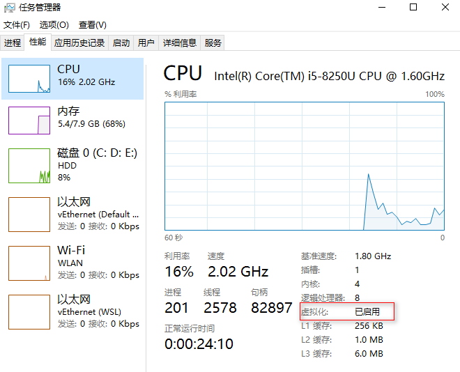 - 需启用 BIOS 中的 VT-x/AMD-V 虚拟化(可通过任务管理器 → 性能 → CPU 查看是否启用)