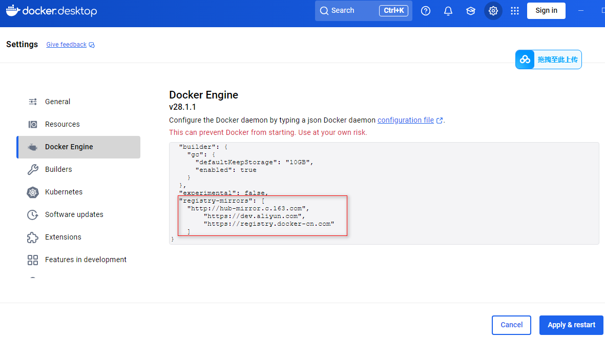 在 Docker Desktop 的 Settings 界面中选择 Docker Engine 选项卡
