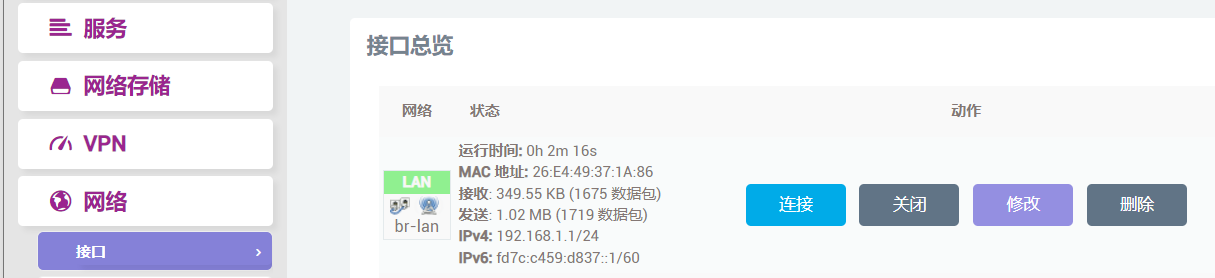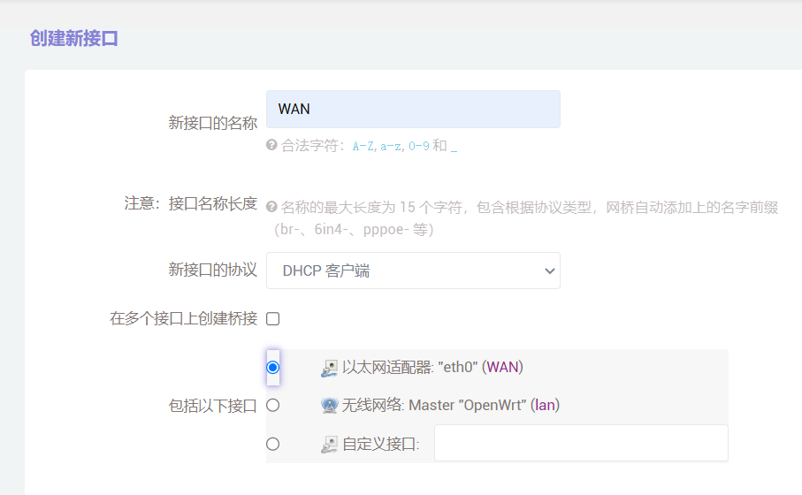 网络--->接口--->添加新接口,配置参照下图,然后保存。