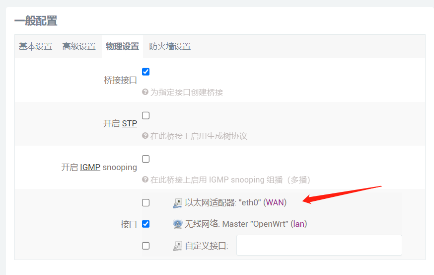 6.这个时候还要配置一下LAN接口的物理设置,默认以太网适配器(eth0)是勾选的,然后现在取消。