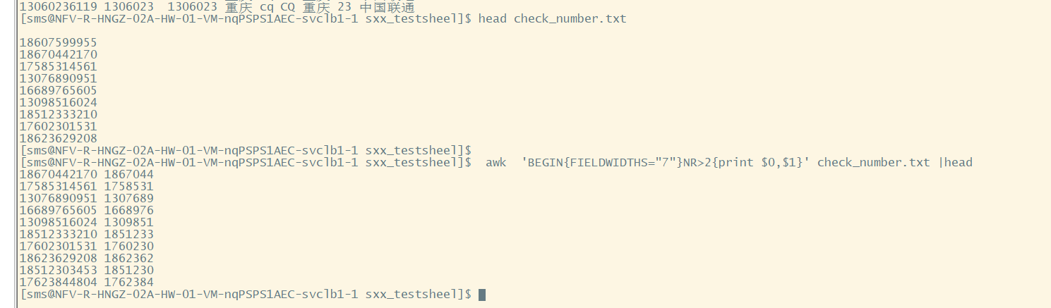 awk 'BEGIN{FIELDWIDTHS="7"}NR>2{print $0,$1}' check_number.txt 分出七位号段