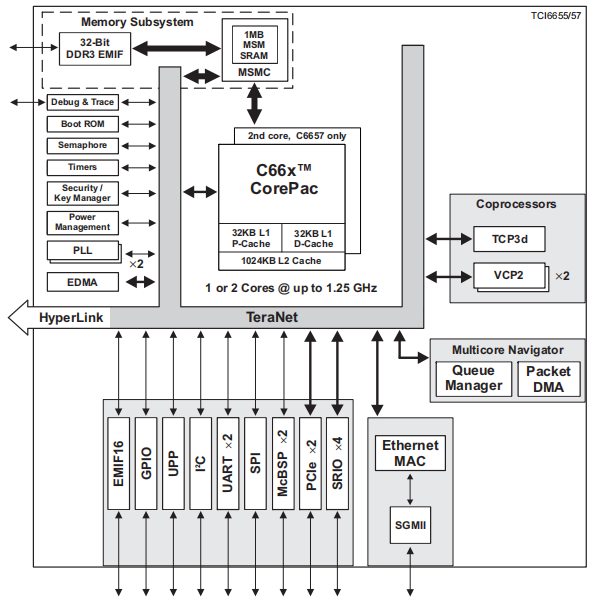 TI C6655/57 DSP 集成了大量片上存储器。除了 32KB 的 L1 程序和数据缓存外,每个内核还有 1024KB 的专用内存,可以配置为映射的 RAM 或缓存。该器件还集成了 1024KB 的多核共享内存,可用作共享 L2 SRAM 和/或共享 L3 SRAM。所有 L2 存储器都集成了错误检测和纠错功能。为了快速访问外部存储器,该器件包括一个运行频率为 1333 MHz 的 32 位 DDR-3 外部存储器接口 (EMIF),并支持 ECC DRAM。