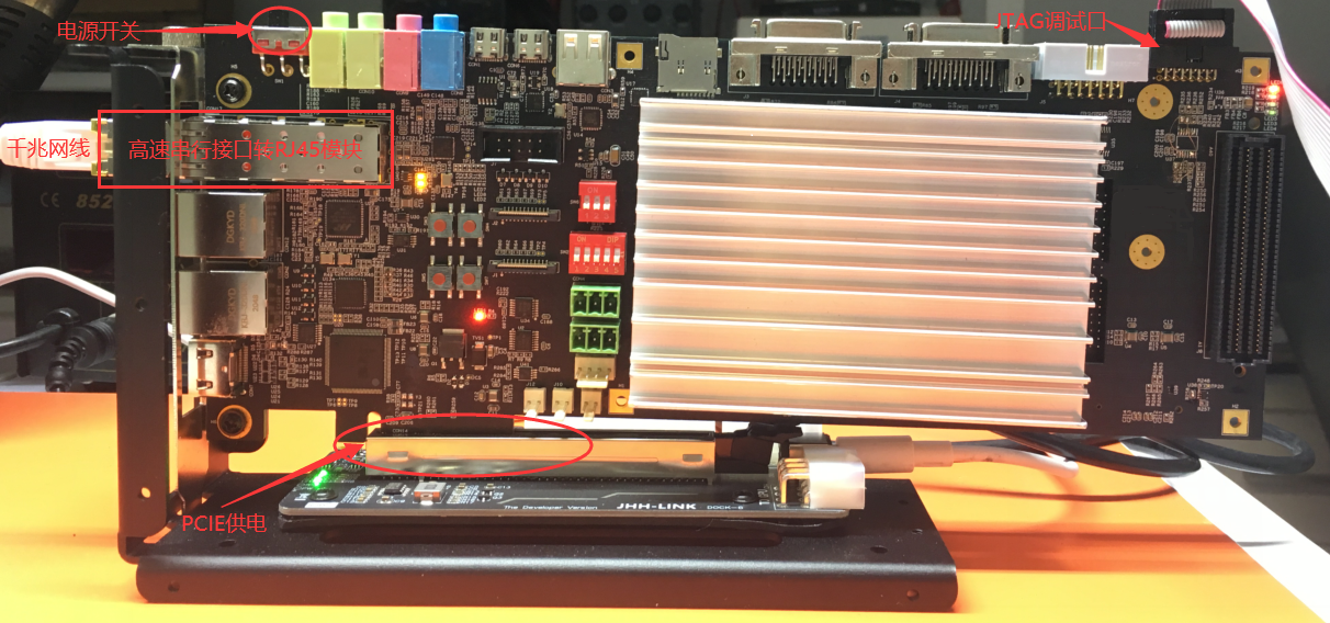 1)使用PCIE供电,连接FPGA JTAG下载线至JTAG调试口,将高速串行接口转RJ45模块插入光口笼子里面,并用千兆网线连接至PC电脑: