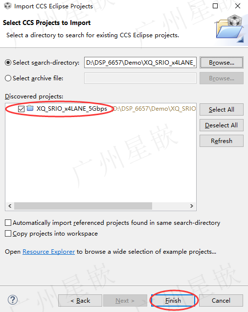 CCS软件将识别到的例程显示在Discovered projects一栏,最后点击Finish: