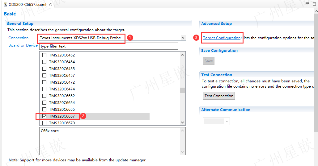 在打开的目标配置文件中,需要配置仿真器类型、器件型号,我们实验用的仿真器为XQ-XDS200U,选中仿真器类型XDS2xx USB Debug Probe即可,器件型号勾选上TMS320C6657,如下图所示,然后点击高级设置项Target Configuration,准备Gel文件设置:
