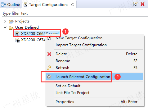 在右边的Target Configuration窗口,双击打开之前创建好的目标配置文件,如下图的XDS200-C6657.ccxml: