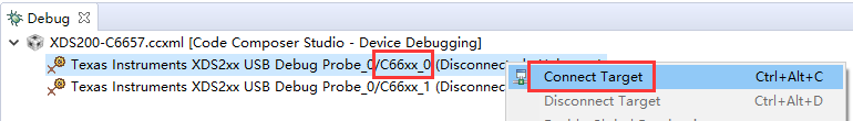 调试窗口打开后,右键单击C66xx_0核心0,并在弹出的菜单中点击Connect Target: