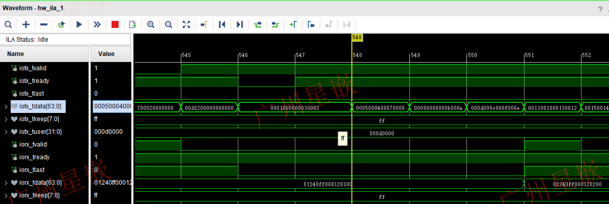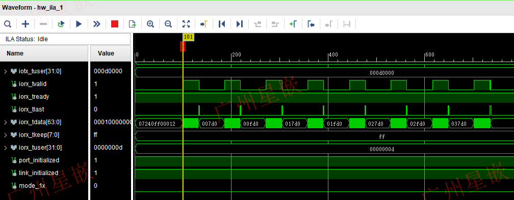 程序下载完成后,点击界面上的“>>”按钮,可实时抓取查看ZYNQ PL端信号运行波形: