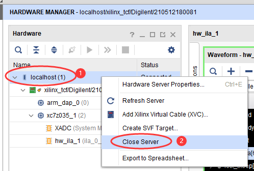 Vivado调试界面Hardware Manager窗口,右键单击localhost(1),在弹出的菜单中点击Close Server,断开ZYNQ JTAG仿真器与板卡的连接:
