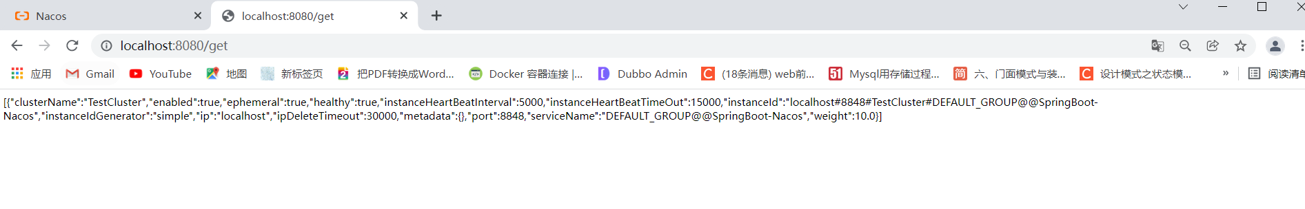 @RestController public class TestController { @NacosValue ( value = "${info:默认值}",autoRefreshed = true) private String info; @NacosInjected private NamingService namingService; //服务注册功能的Service //查询注册信息 @GetMapping("/get") public String get() throws NacosException { // return info; return namingService.getAllInstances ( "SpringBoot-Nacos" ).toString (); } //注册的代码 @PostMapping("/registry") public String registry() throws NacosException { //通过Instance注册服务 Instance instance=new Instance (); instance.setClusterName("TestCluster"); //集群名称 instance.setEnabled(true); //是否启用 instance.setEphemeral(true); //临时节点/持久化节点, CP(Raft), AP(Distro) instance.setIp("localhost"); instance.setPort(8848); instance.setWeight(10); //1~100 namingService.registerInstance("SpringBoot-Nacos",instance); return "SUCCESS"; } }
