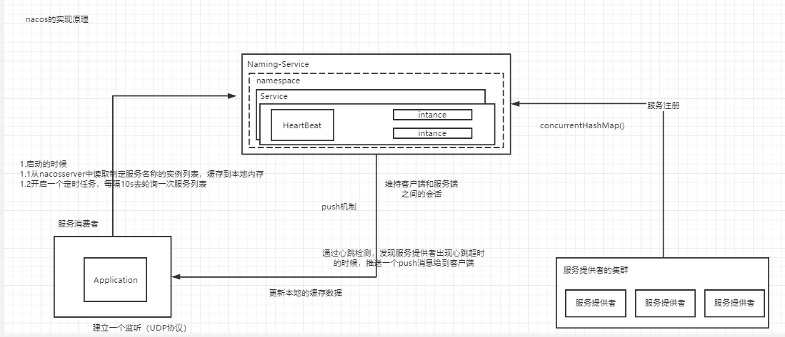 上面这张图我在写eureka时就画过,这里拿来用下,因为学习同类型东西就是要学会找相同点和不同点,其实Eureka和nacos的注册和消费流程都是一样的,不同点其实就两块,第一块Eureka在数据同步时没有选举的机制,第二点在数据同步时通知客户端的方式不同;