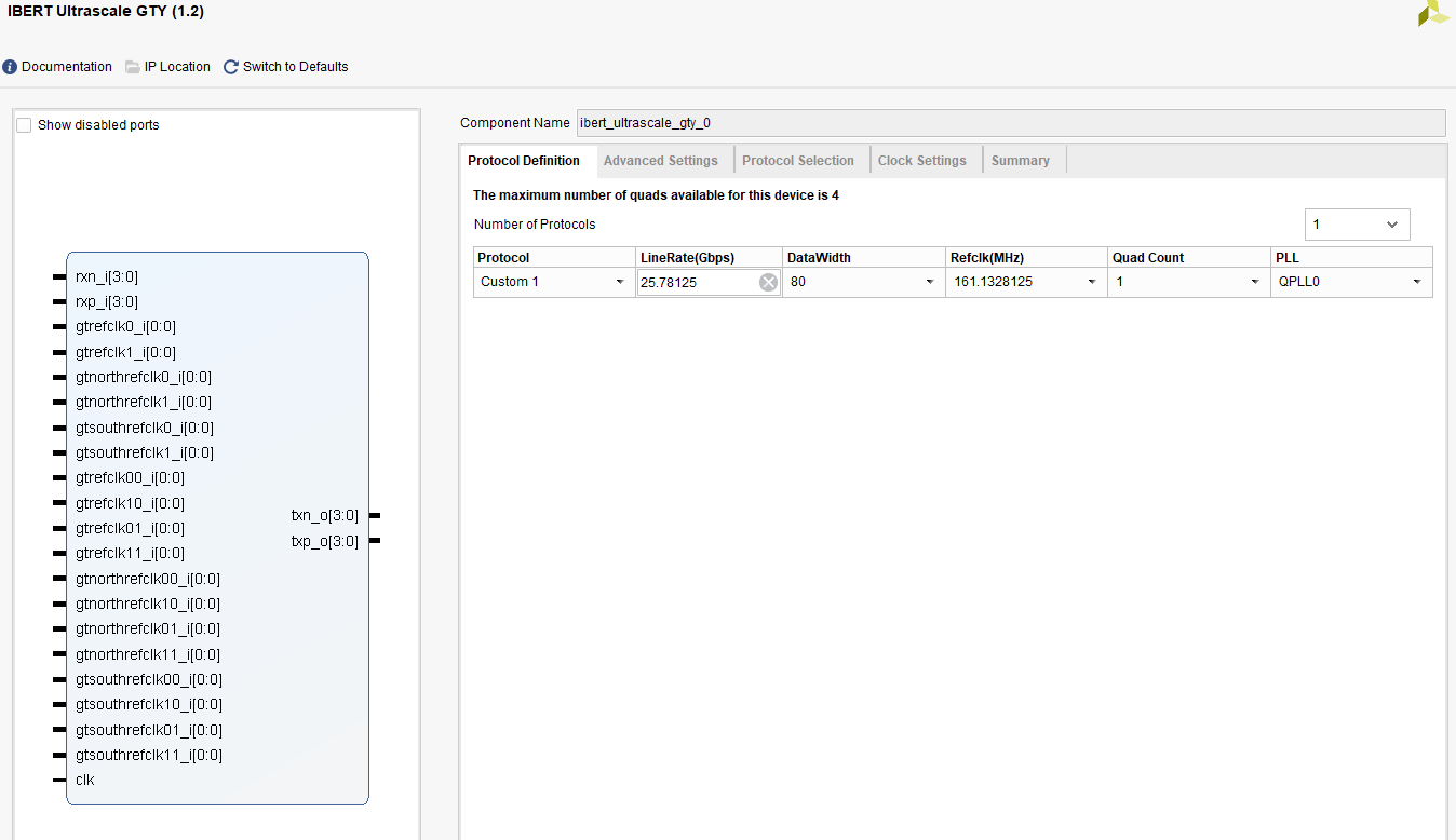 板子有2个SFP+的光纤接口,最大支持25G速率,使用ibert 进行验证,SFP在BANK227的GTY 接口。