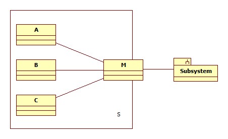 若我们将 A、B、C、M 看作一个子系统 S,则可将 M 视为这个子系统的边界(或称门面)。其它子系统可以通过这道边界访问 S,而不必了解 S 的内部细节(A、B、C等)。