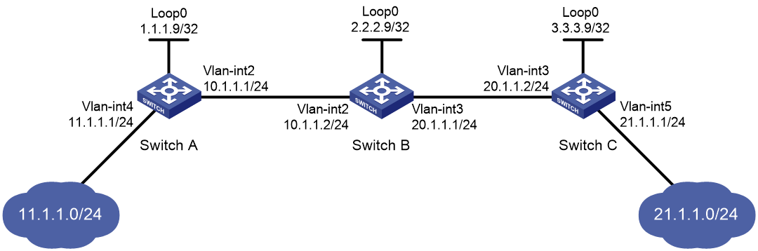 # 配置Switch C [SwitchC] mpls lsr-id 3.3.3.9 [SwitchC] interface vlan-interface 3 [SwitchC-Vlan-interface3] mpls enable