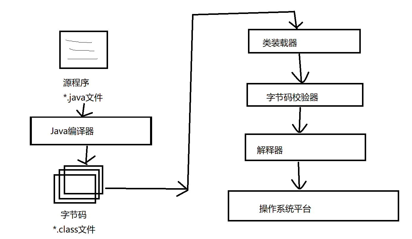 Java语言写的源程序通过Java编译器,编译成与平台无关的‘字节码程序’(.class文件,也就是0,1二进制程序),然后在OS之上的Java解释器中解释执行。