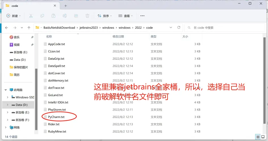 因为这个激活包是可以适用jetbrains全家桶的,所以里面生成了对应软件名的txt文件,只需选择当前正在操作的软件即可。