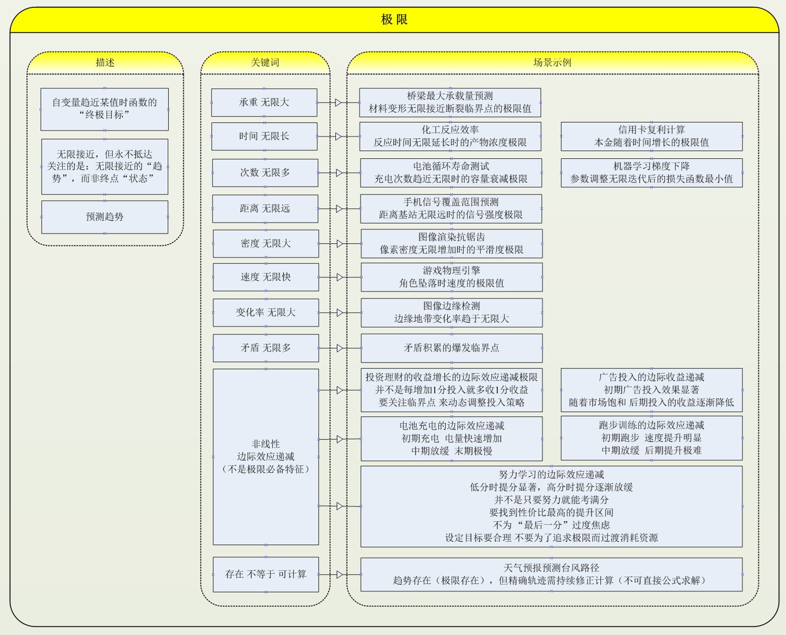 极限, 是非线性的, 在很多情况下具有边际效应递减的特性。