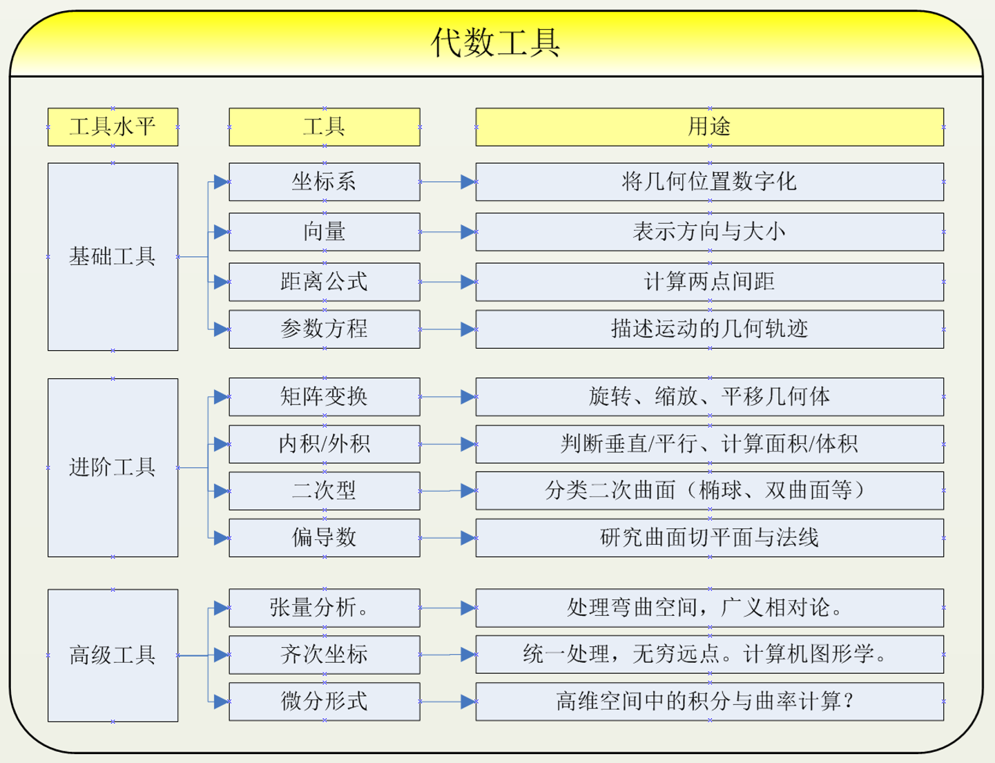 解析几何 是使用了 代数 作为工具,通过代数工具(方程、向量、矩阵等),对空间中的几何对象(点、线、面、体)进行定量分析和计算,那么,有哪些可用的代数工具呢?