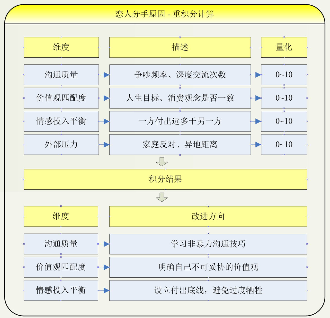 例如,对于恋人分手的原因进行积分计算,需要先分析可能的方面: