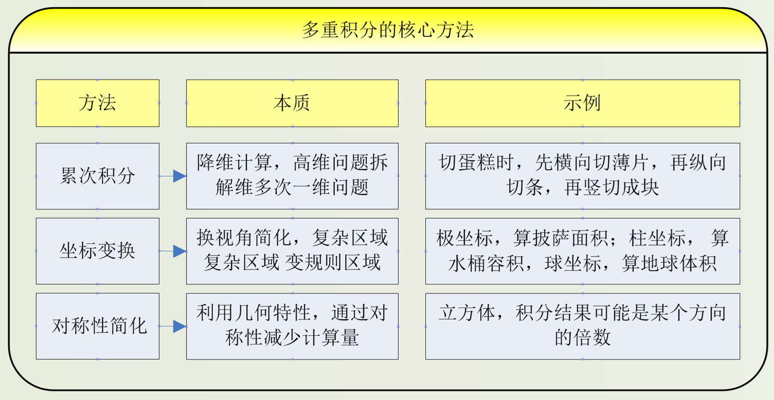 那肯定是一次积分无法解决问题。 举个例子,比如对于一个立方体,里面的每一个角落密度都不均匀,那如何计算它的总质量呢?有人要说了,直接用秤,一次性称一下不就行了?那么如果它无限大呢?哪来的那么大的秤呢?是不是要拆分一下?所以我们要有规则的把它逐层拆开来,先把它切成一层一层的,再把每一层切成一条一条的,再把每一条切成一块一块的,这小块块儿要大到什么程度呢?这个颗粒度要满足让它每一个颗粒度的密度基本上是均匀的,那这个粒度就是合适的。所以,这里进行了切片、切条、切块,这大致就类似于分别进行了x、y、z三个维度的划分,即:把三维拆解成一维处理,就是三重积分。所以,重积分的本质,是:降维。