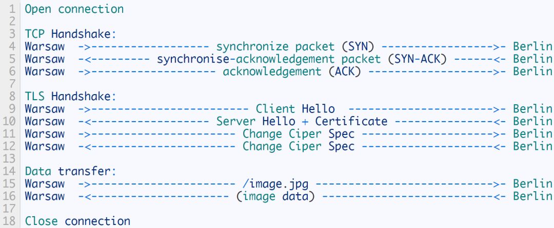 使用 HTTPS,在 TCP 之上需要增加 TLS 握手。这大大增加了此前实际数据传输的时间。假设你从华沙请求 /image.jpg,并接入到柏林最近的服务器: