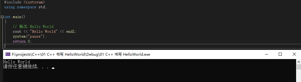 #include <iostream> using namespace std; int main() { // 输出 Hello World cout << "Hello World" << endl; system("pause"); return 0; }