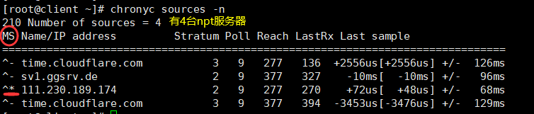 #修改配置文件 vim /etc/chrony.conf #a.注释其他server开头的配置,添加本地NTP公共时间同步服务器 server 192.168.0.24 iburst #b.重启chronyd服务&&设置服务随机自启 systemctl restart chronyd systemctl enable chronyd #c.查看时间同步源 chronyc sources -n