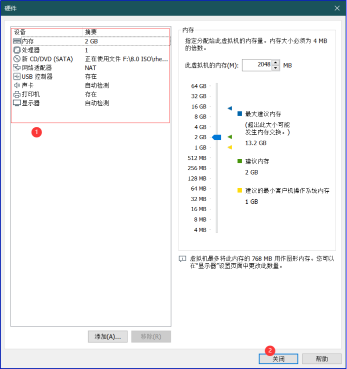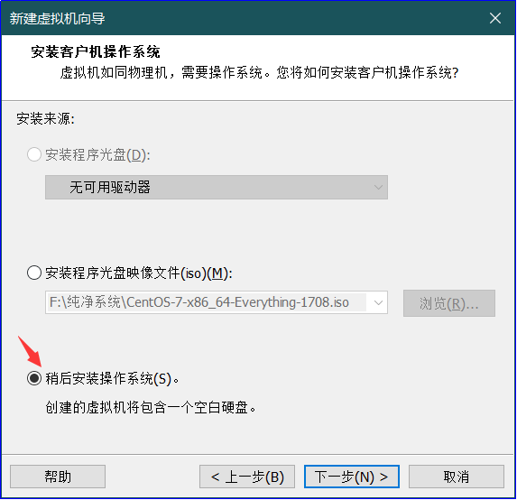 硬盘20G 自定义硬件:内存2048,CD/DVD选使用物理驱动器(如果没光盘和U盘就会在广播中找PXE) 开机后出现:无法连接虚拟设备ide1:0,选择否