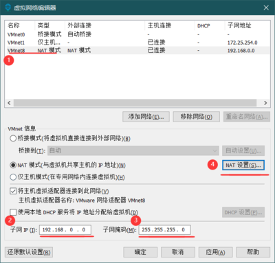 三种模式都是为了使虚拟机和本机能够通信。我们下载完VMware后就会在电脑上增加两个虚拟网卡VMnet1和VMnet8。分别对应仅主机模式和NAT模式。桥接模式应该对应VMnet0,但是并没有显示。