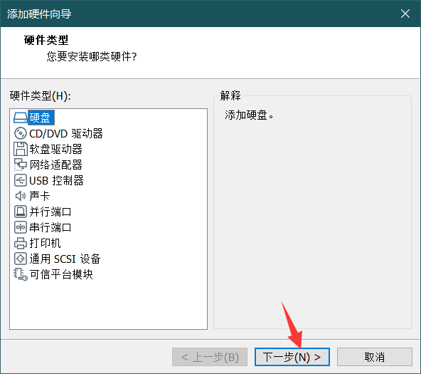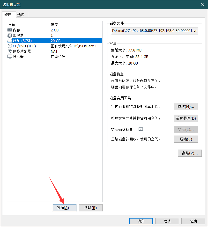 1.虚拟机处于关机状态时,选择硬盘,点击添加,下一步