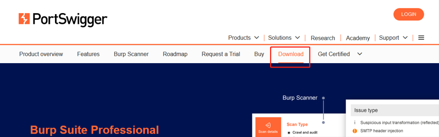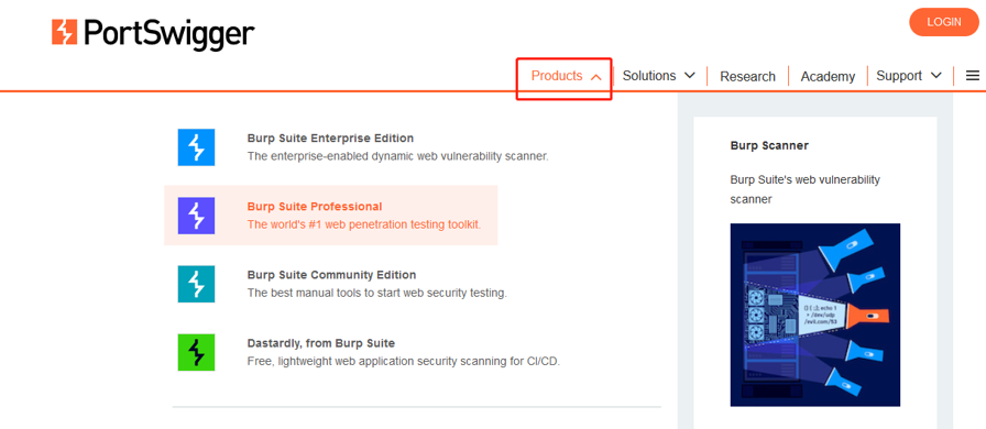 1、进入官网https://portswigger.net,点击Products->选择需要的软件产品。Burp Suite有免费版和付费版之分。免费版虽然功能有限,但已经足够初学者使用。如果需要更多高级功能,可以考虑购买专业版。