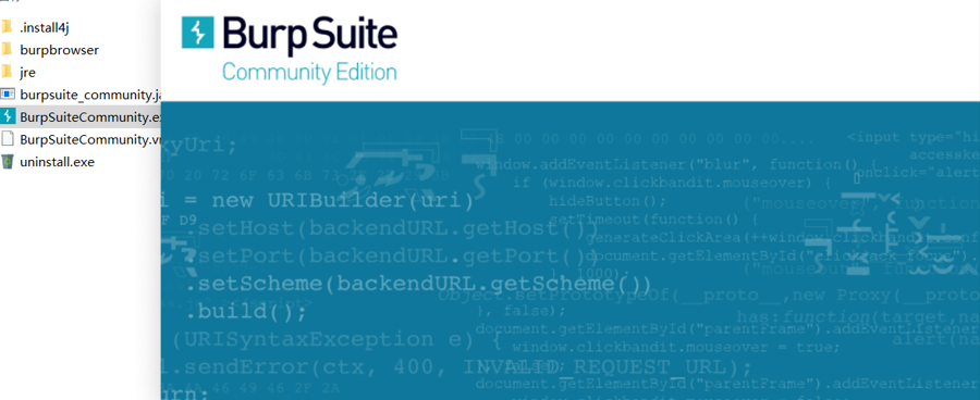 3、安装完成后,进入安装目录,找到BurpSuiteCommunity.exe,双击开始运行