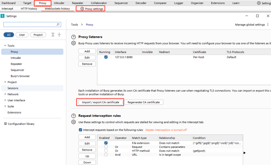 1、找到Proxy->Proxy settings,点击“Import /export CA certificate”,导出证书