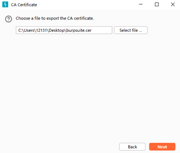3、选择文件目录,并命名为burpsuite.cer, 点击Next,导出成功。