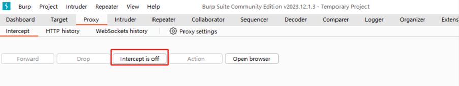 2、打开burpsuite->Proxy->Intercept,点击Intercept is off