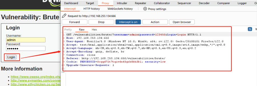 3、再去操作登录,输入admin、密码先随意输入一个,点击Login,就可以看到拦截的登录信息。右键拦截的登录信息界面-->选择 Send to Intruder。